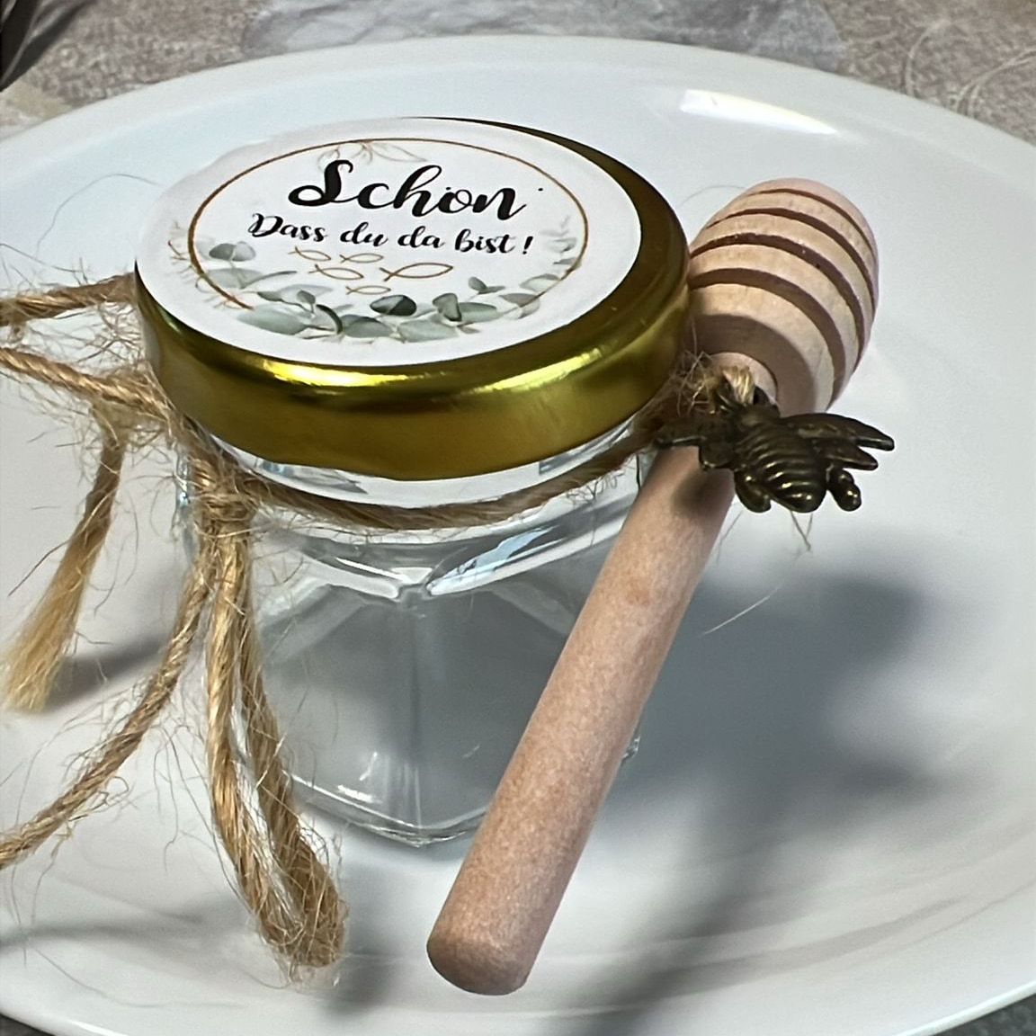 Wenn du dir Zeit sparen möchtest, kannst du dich für unsere fertig dekorierten Honiggläser entscheiden. Sie werden mit Mini-Holzlöffel, Kordel, Aufkleber und liebevollen Details geliefert und sind sofort verschenkfertig.