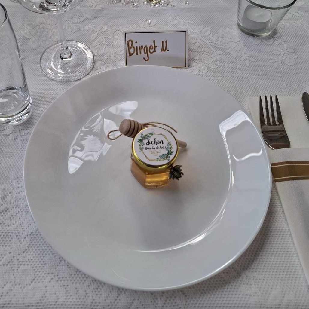 Egal, ob du deine Honiggläser ganz nach deinem eigenen Stil gestalten oder eine liebevoll dekorierte Komplettlösung bevorzugst – bei uns findest du das passende Gastgeschenk für deine Feier. Unsere hochwertigen Honiggläschen mit 50 g regionalem Honig sind die perfekte Wahl für Hochzeiten, Taufen, Kommunionen, Konfirmationen, Jubiläen und jede andere festliche Gelegenheit.