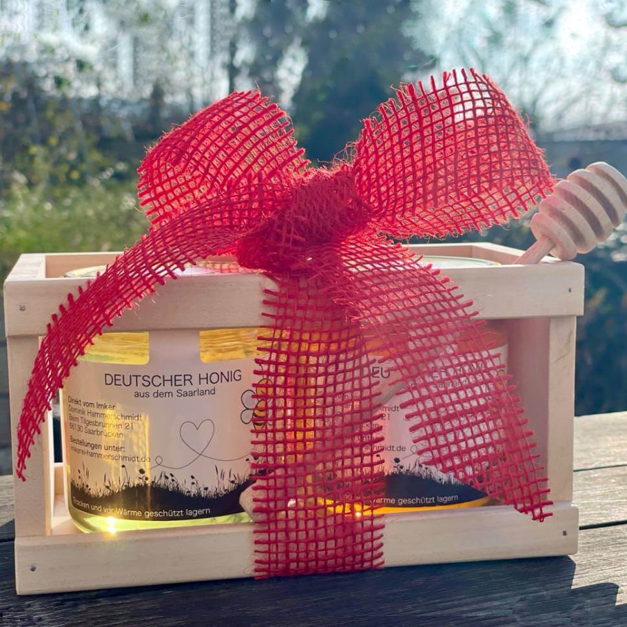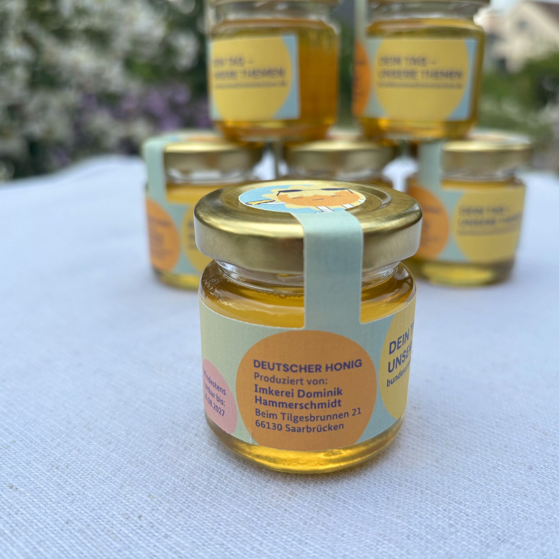 Unsere personalisierten Honiggläser sind mehr als nur ein kleines Geschenk – sie sind ein hochwertiges, nachhaltiges Werbemittel mit emotionaler Wirkung. Ob als stilvolles Give-away auf Messen und Tagungen oder als Dankeschön für treue Kunden: Mit Honig aus eigener Imkerei setzen Sie auf Qualität, Regionalität und Wertschätzung.